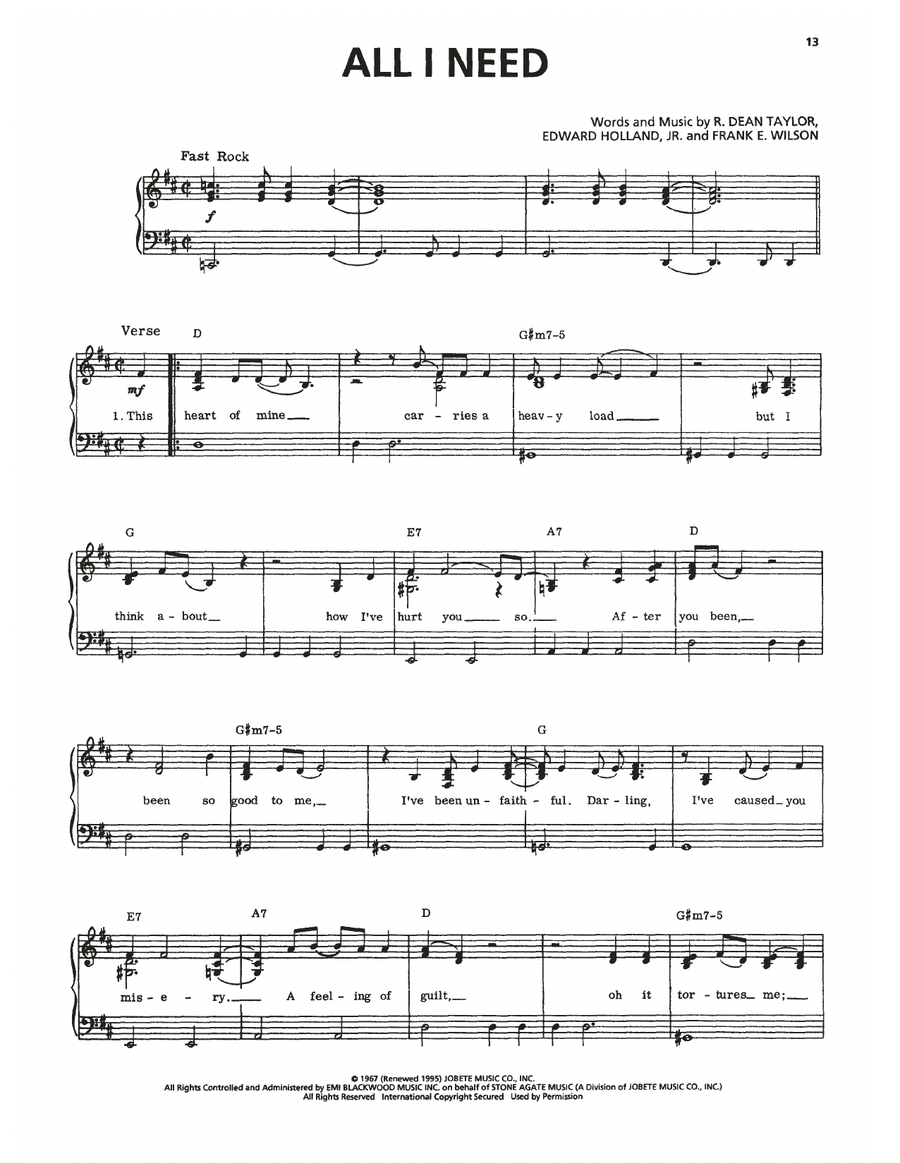 Download or print The Temptations All I Need sheet music, chords and digital score arranged for Piano, Vocal & Guitar Chords (Right-Hand Melody). This Soul score includes 3 page(s).