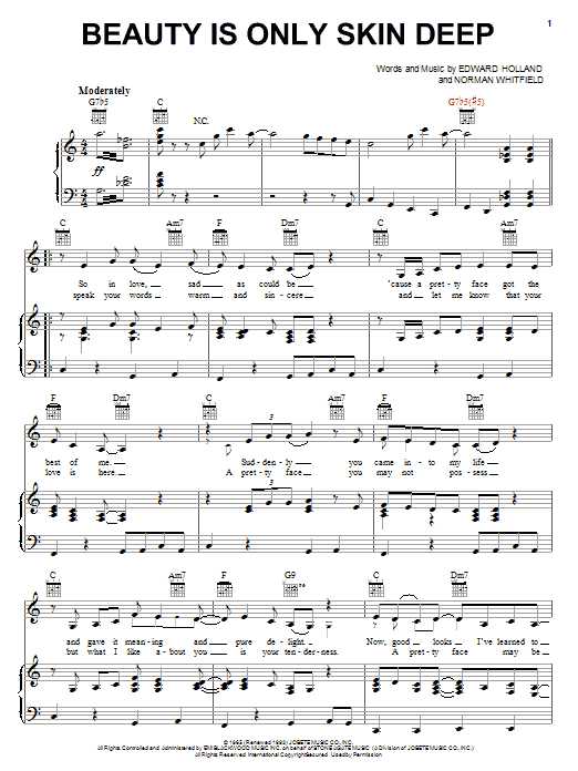Download or print The Temptations Beauty Is Only Skin Deep sheet music, chords and digital score arranged for Piano, Vocal & Guitar Chords (Right-Hand Melody). This Pop score includes 4 page(s).