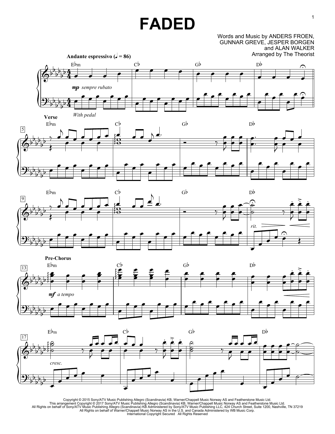 Download or print The Theorist Faded sheet music, chords and digital score arranged for Piano Solo. This Pop score includes 4 page(s).