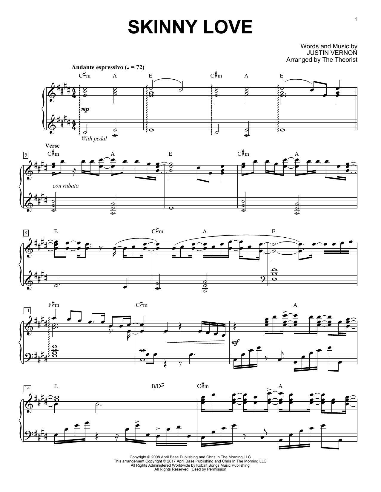 Download or print The Theorist Skinny Love sheet music, chords and digital score arranged for Piano Solo. This Pop score includes 5 page(s).