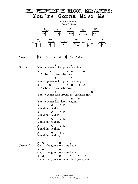 Download or print The Thirteenth Floor Elevators You're Gonna Miss Me sheet music, chords and digital score arranged for Guitar Chords/Lyrics. This Rock score includes 2 page(s).