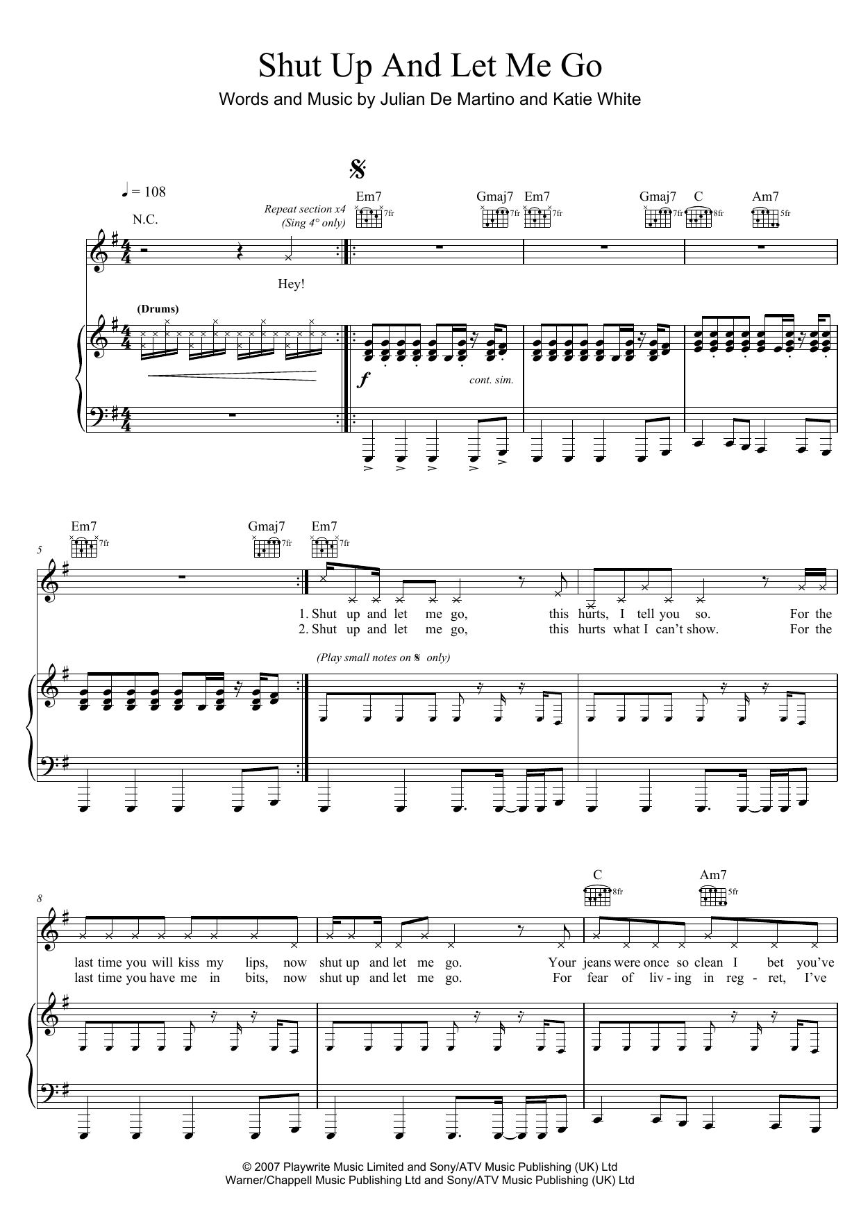 Download or print The Ting Tings Shut Up And Let Me Go sheet music, chords and digital score arranged for Piano, Vocal & Guitar Chords (Right-Hand Melody). This Pop score includes 3 page(s).