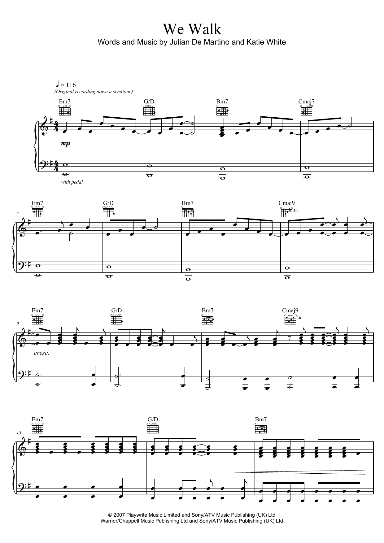 Download or print The Ting Tings We Walk sheet music, chords and digital score arranged for Piano, Vocal & Guitar Chords (Right-Hand Melody). This Pop score includes 5 page(s).