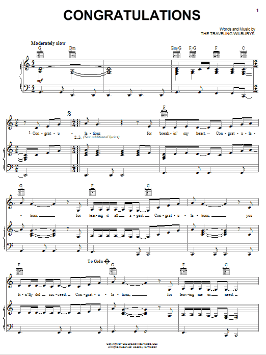 Download or print The Traveling Wilburys Congratulations sheet music, chords and digital score arranged for Piano, Vocal & Guitar Chords (Right-Hand Melody). This Pop score includes 3 page(s).