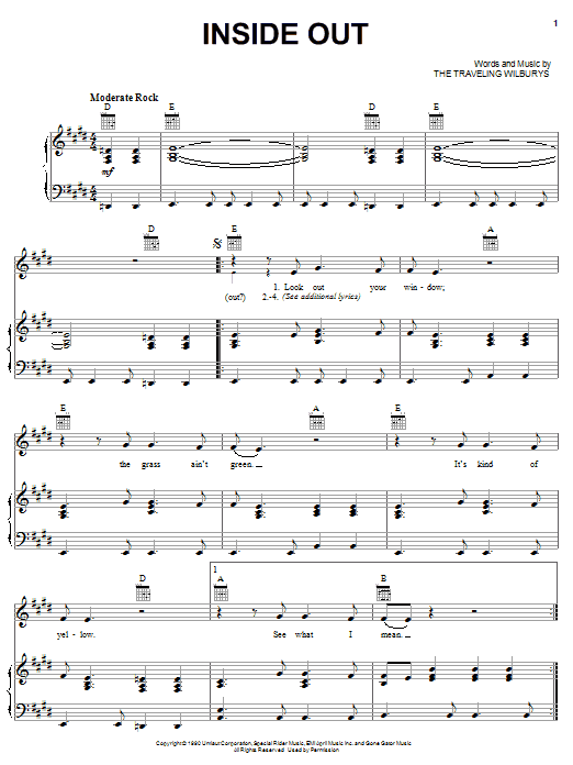 Download or print The Traveling Wilburys Inside Out sheet music, chords and digital score arranged for Piano, Vocal & Guitar Chords (Right-Hand Melody). This Pop score includes 6 page(s).