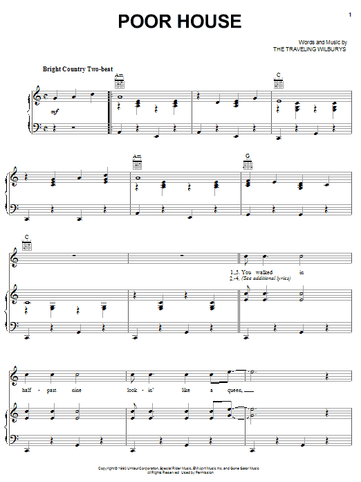 Download or print The Traveling Wilburys Poor House sheet music, chords and digital score arranged for Piano, Vocal & Guitar Chords (Right-Hand Melody). This Pop score includes 3 page(s).