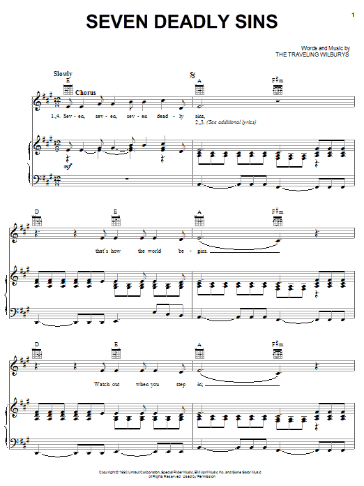 Download or print The Traveling Wilburys Seven Deadly Sins sheet music, chords and digital score arranged for Piano, Vocal & Guitar Chords (Right-Hand Melody). This Pop score includes 4 page(s).
