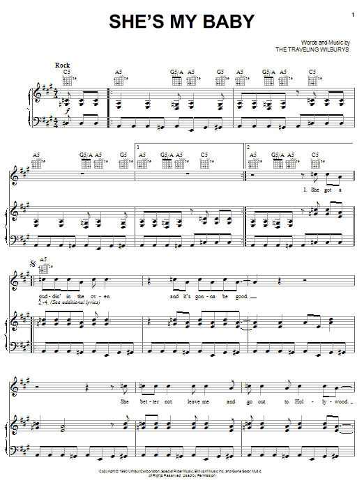 Download or print The Traveling Wilburys She's My Baby sheet music, chords and digital score arranged for Piano, Vocal & Guitar Chords (Right-Hand Melody). This Pop score includes 4 page(s).