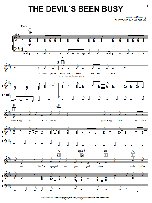 Download or print The Traveling Wilburys The Devil's Been Busy sheet music, chords and digital score arranged for Piano, Vocal & Guitar Chords (Right-Hand Melody). This Pop score includes 4 page(s).