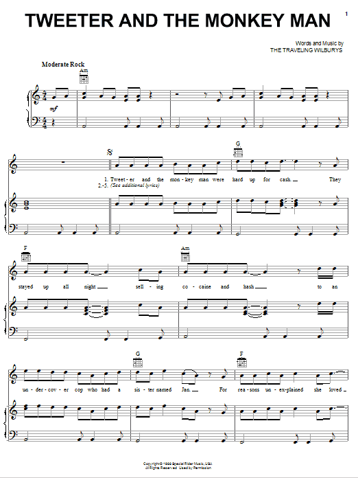 Download or print The Traveling Wilburys Tweeter And The Monkey Man sheet music, chords and digital score arranged for Piano, Vocal & Guitar Chords (Right-Hand Melody). This Pop score includes 4 page(s).