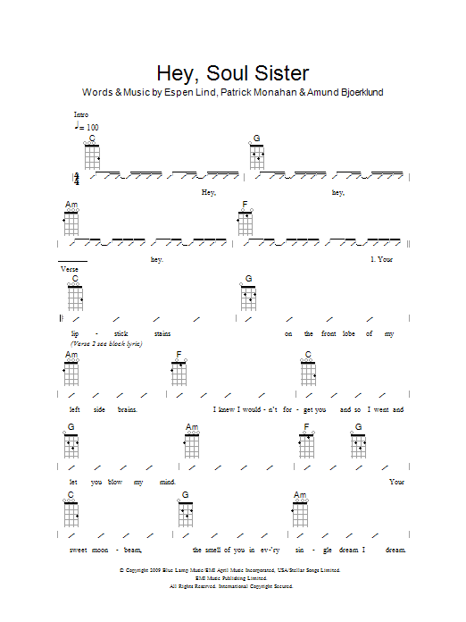 Download or print The Ukuleles Hey, Soul Sister sheet music, chords and digital score arranged for Ukulele Chords/Lyrics. This Pop score includes 4 page(s).
