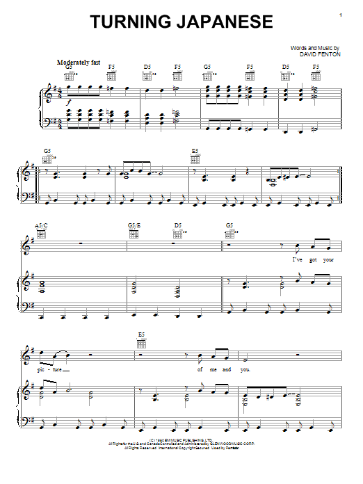 Download or print The Vapors Turning Japanese sheet music, chords and digital score arranged for Piano, Vocal & Guitar Chords (Right-Hand Melody). This Pop score includes 9 page(s).