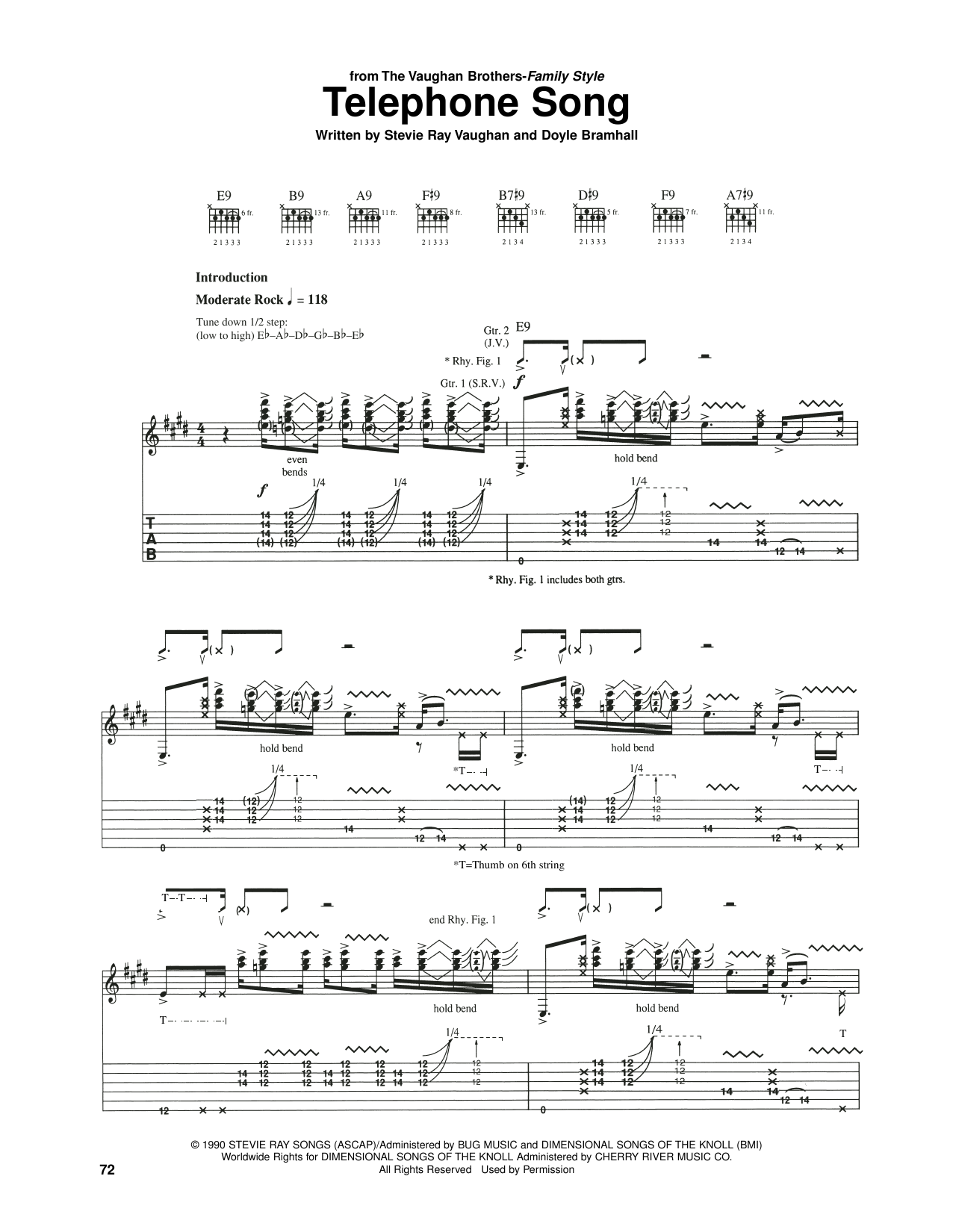 Download or print The Vaughan Brothers Telephone Song sheet music, chords and digital score arranged for Guitar Tab. This Blues score includes 15 page(s).