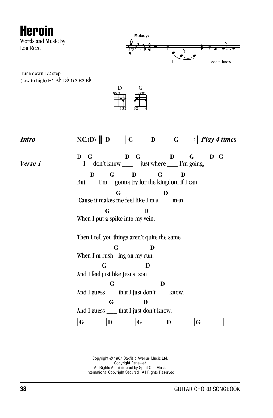 Download or print The Velvet Underground Heroin sheet music, chords and digital score arranged for Guitar Chords/Lyrics. This Country score includes 4 page(s).