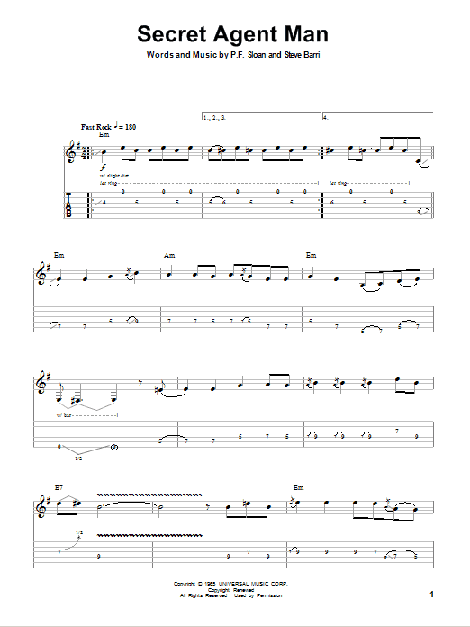 Download or print The Ventures Secret Agent Man sheet music, chords and digital score arranged for Guitar Tab (Single Guitar). This Film/TV score includes 5 page(s).