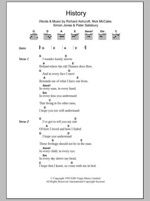 Download or print The Verve History sheet music, chords and digital score arranged for Guitar Chords/Lyrics. This Rock score includes 3 page(s).