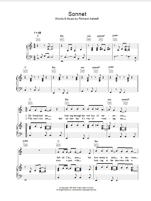 Download or print The Verve Sonnet sheet music, chords and digital score arranged for Piano, Vocal & Guitar Chords. This Rock score includes 5 page(s).