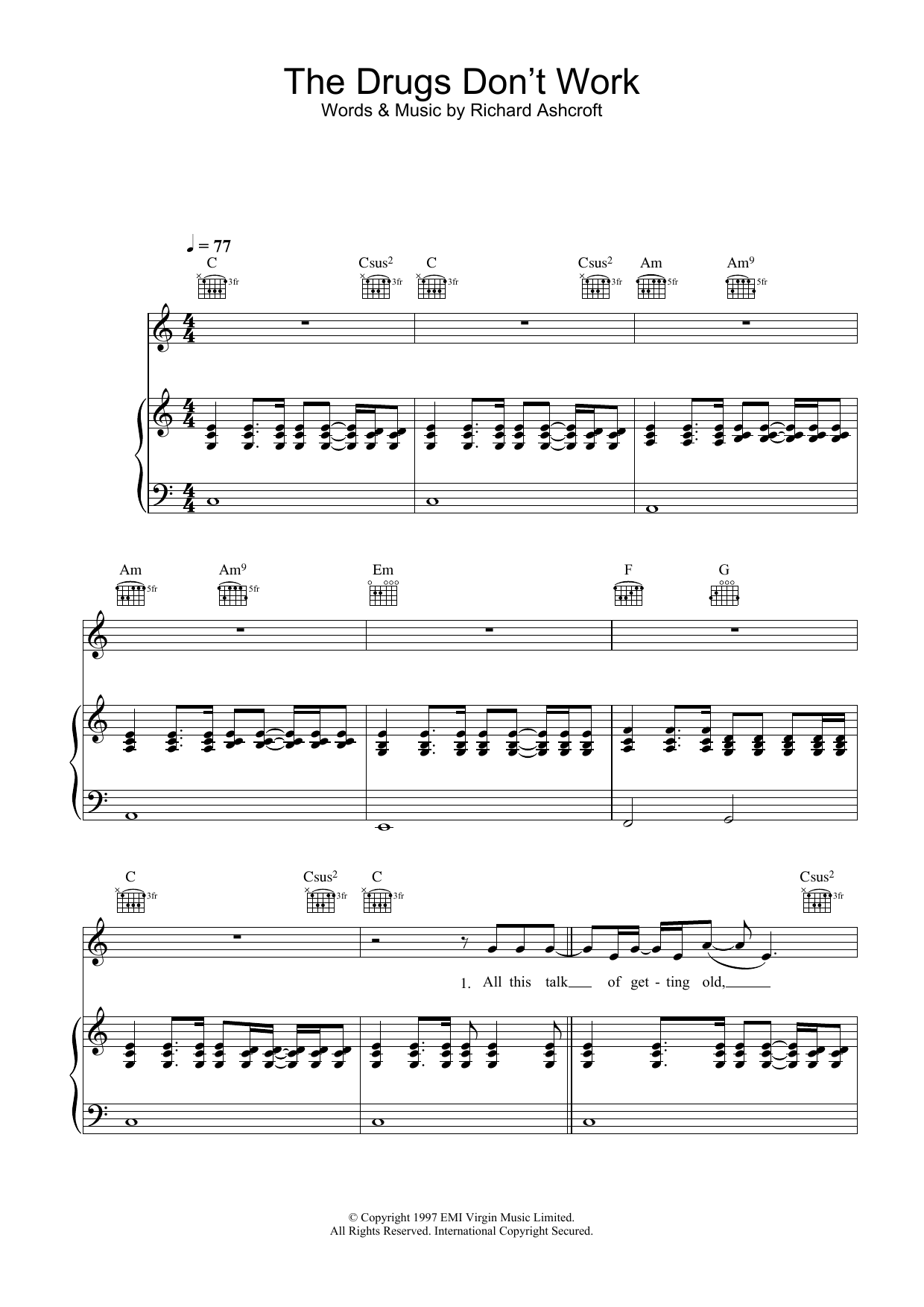 Download or print The Verve The Drugs Don't Work sheet music, chords and digital score arranged for Guitar Chords/Lyrics. This Pop score includes 3 page(s).