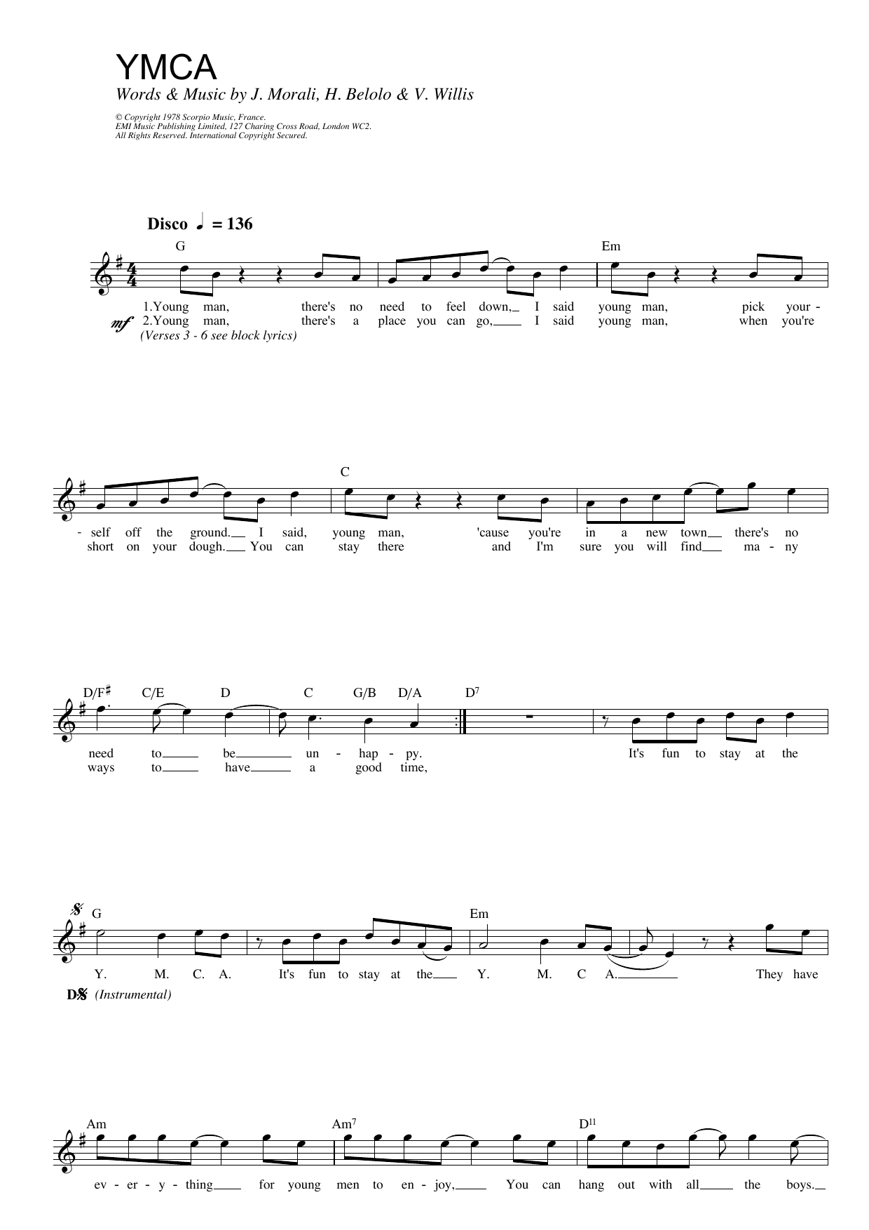 Download or print Village People Y.M.C.A. sheet music, chords and digital score arranged for Piano, Vocal & Guitar Chords. This Disco score includes 4 page(s).