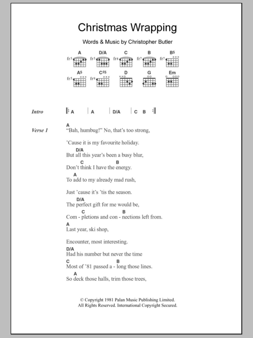 Download or print The Waitresses Christmas Wrapping sheet music, chords and digital score arranged for Guitar Chords/Lyrics. This Christmas score includes 5 page(s).