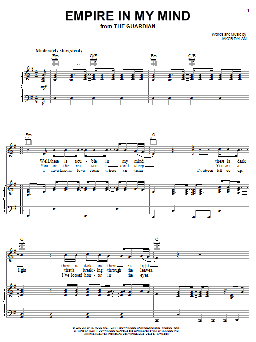 Download or print The Wallflowers Empire In My Mind sheet music, chords and digital score arranged for Piano, Vocal & Guitar Chords (Right-Hand Melody). This Film/TV score includes 5 page(s).