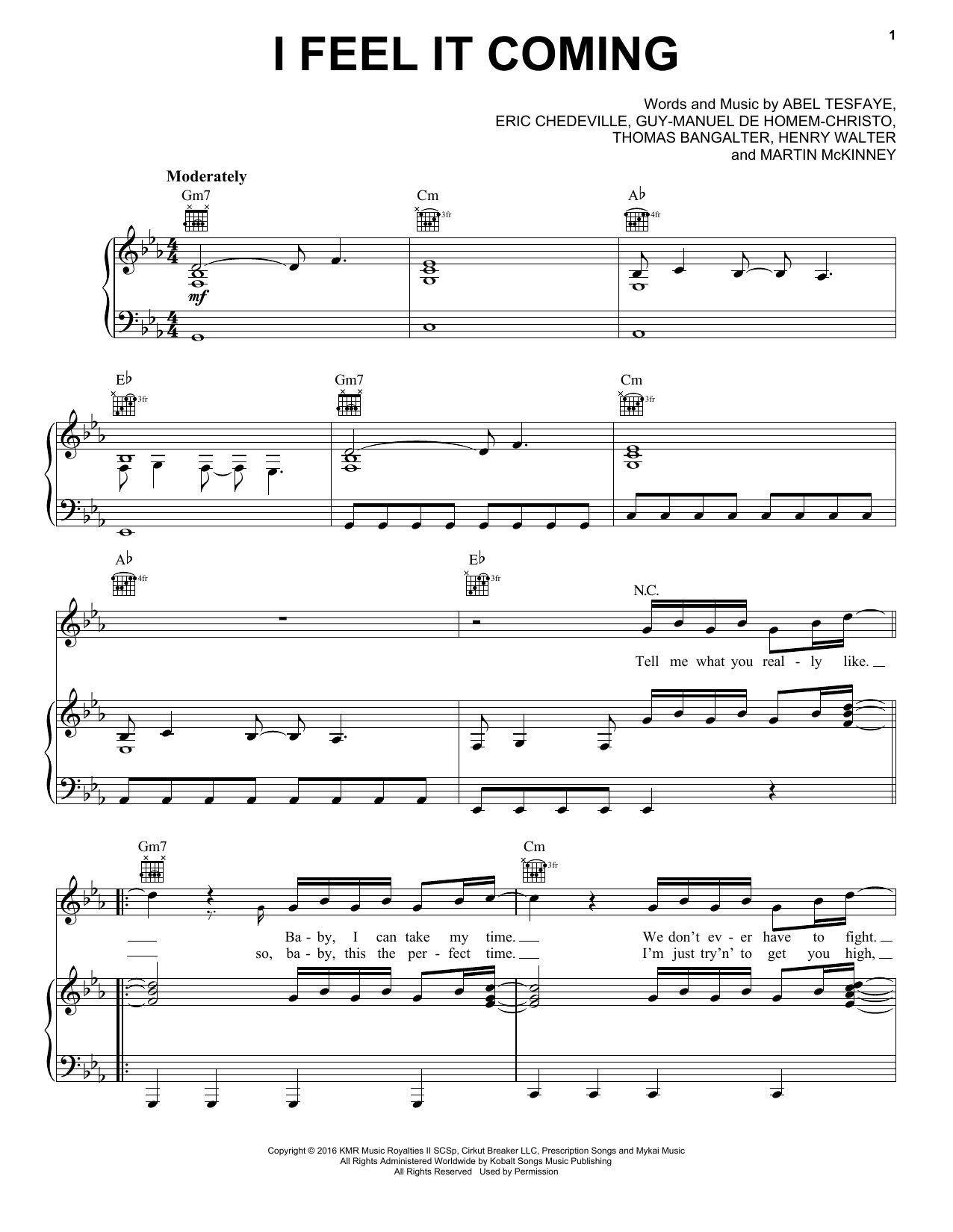Download or print The Weeknd I Feel It Coming sheet music, chords and digital score arranged for Piano, Vocal & Guitar Chords (Right-Hand Melody). This Pop score includes 6 page(s).