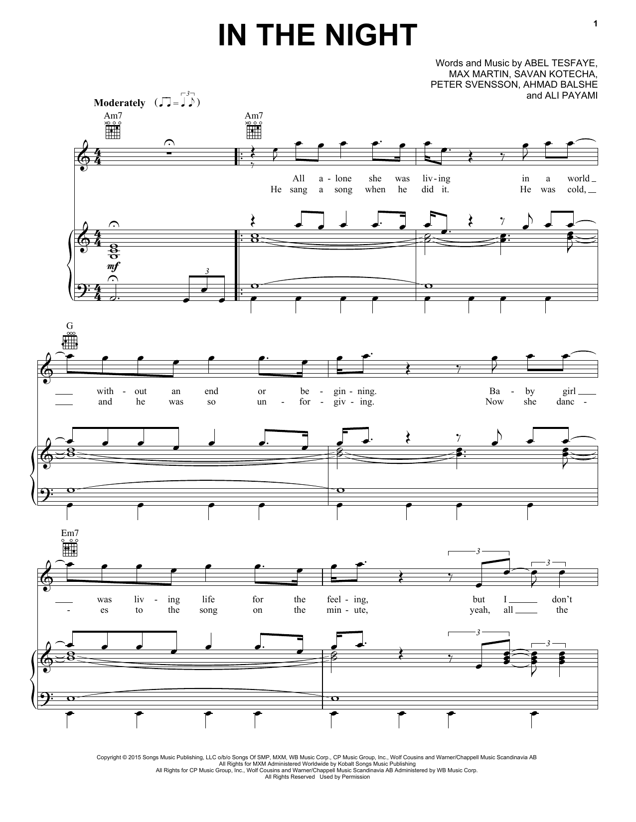 Download or print The Weeknd In The Night sheet music, chords and digital score arranged for Piano, Vocal & Guitar Chords (Right-Hand Melody). This Pop score includes 5 page(s).