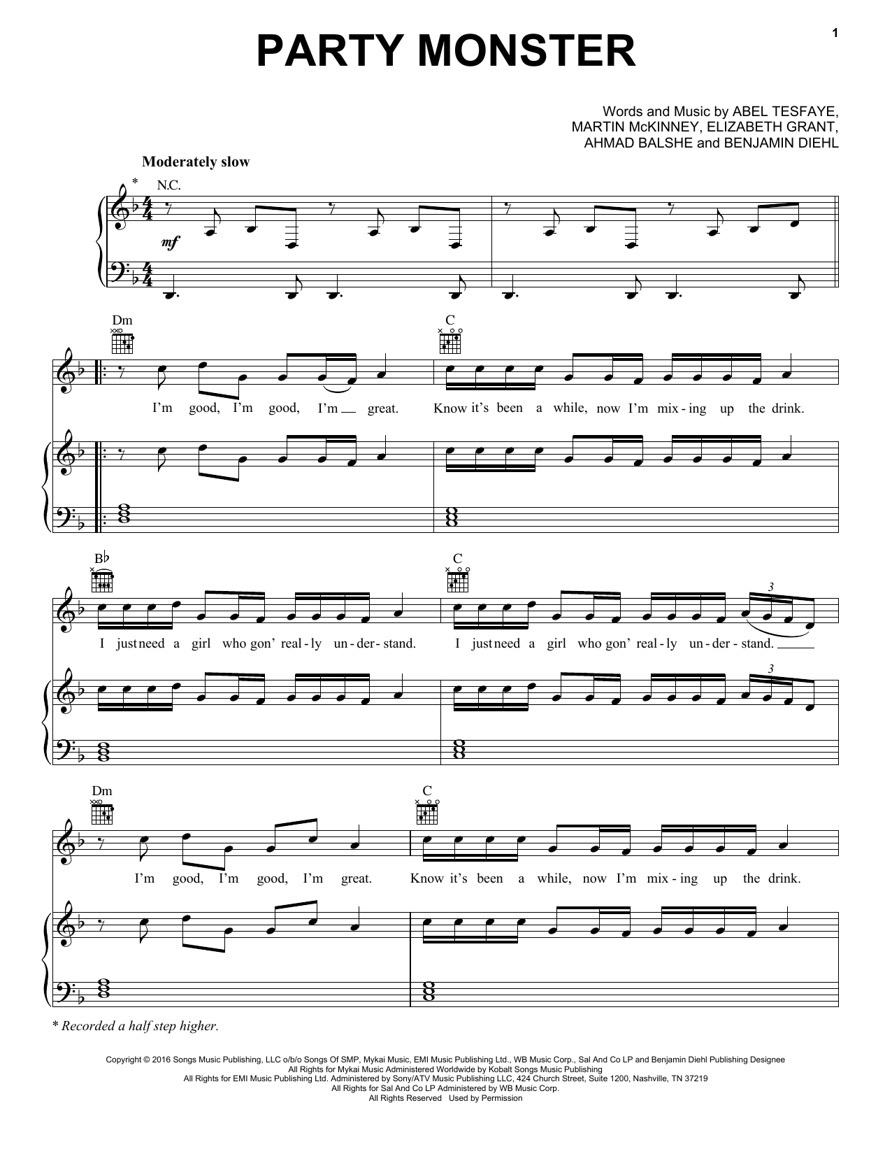 Download or print The Weeknd Party Monster sheet music, chords and digital score arranged for Piano, Vocal & Guitar Chords (Right-Hand Melody). This Pop score includes 6 page(s).