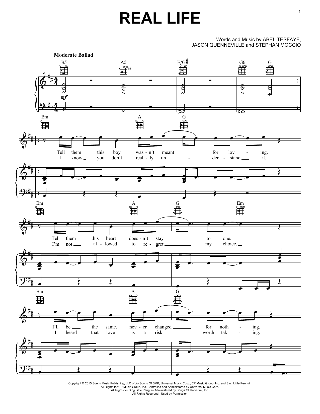 Download or print The Weeknd Real Life sheet music, chords and digital score arranged for Piano, Vocal & Guitar Chords (Right-Hand Melody). This Pop score includes 5 page(s).