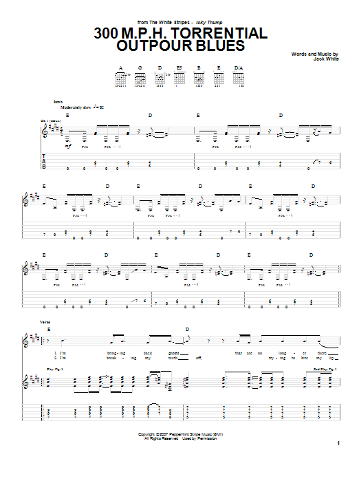 Download or print The White Stripes 300 MPH Torrential Outpour Blues sheet music, chords and digital score arranged for Guitar Tab. This Pop score includes 9 page(s).