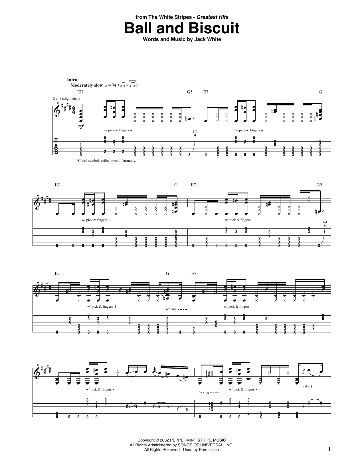 Download or print The White Stripes Ball And Biscuit sheet music, chords and digital score arranged for Guitar Tab. This Rock score includes 20 page(s).