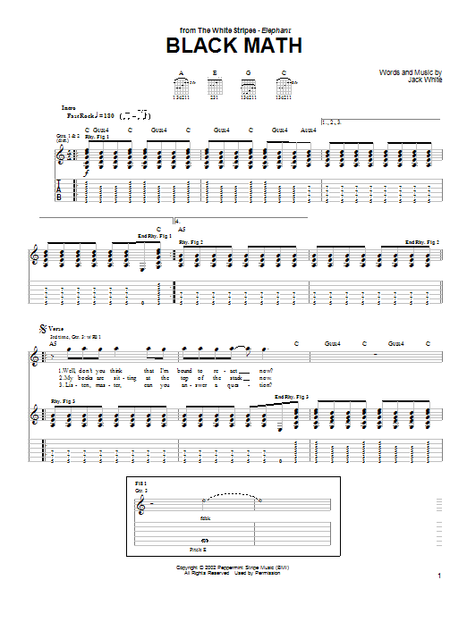 Download or print The White Stripes Black Math sheet music, chords and digital score arranged for Guitar Tab. This Pop score includes 5 page(s).