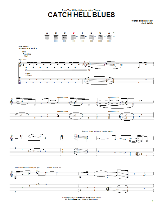 Download or print The White Stripes Catch Hell Blues sheet music, chords and digital score arranged for Guitar Tab. This Pop score includes 8 page(s).