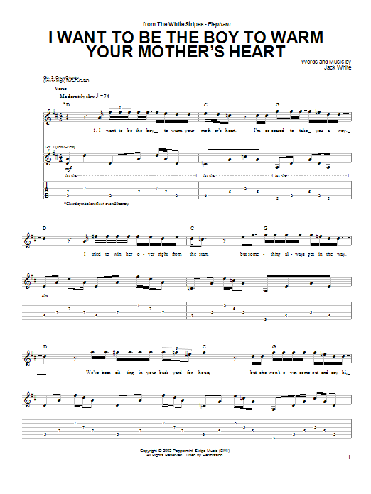 Download or print The White Stripes I Want To Be The Boy To Warm Your Mother's Heart sheet music, chords and digital score arranged for Guitar Tab. This Pop score includes 9 page(s).