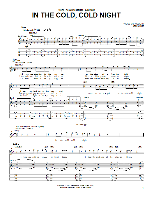 Download or print The White Stripes In The Cold, Cold Night sheet music, chords and digital score arranged for Guitar Tab. This Pop score includes 4 page(s).