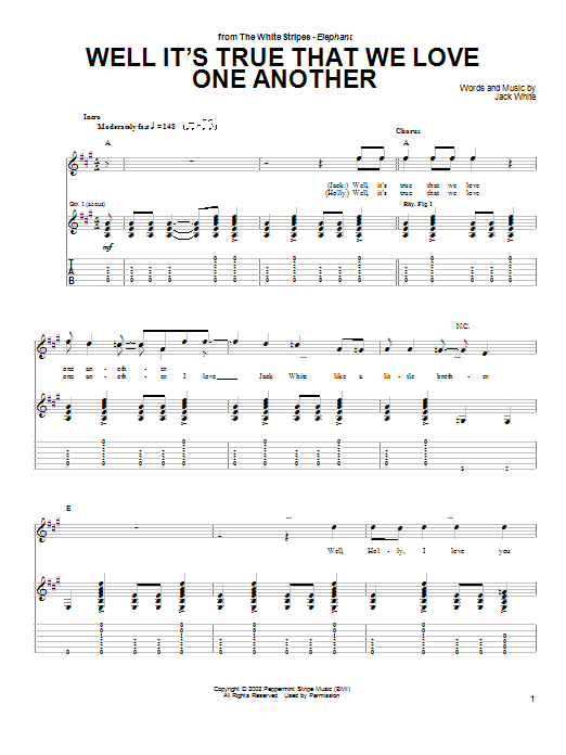Download or print The White Stripes Well It's True That We Love One Another sheet music, chords and digital score arranged for Guitar Tab. This Pop score includes 6 page(s).
