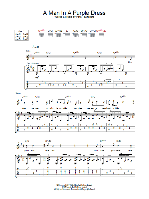 Download or print The Who A Man In A Purple Dress sheet music, chords and digital score arranged for Guitar Tab. This Rock score includes 8 page(s).
