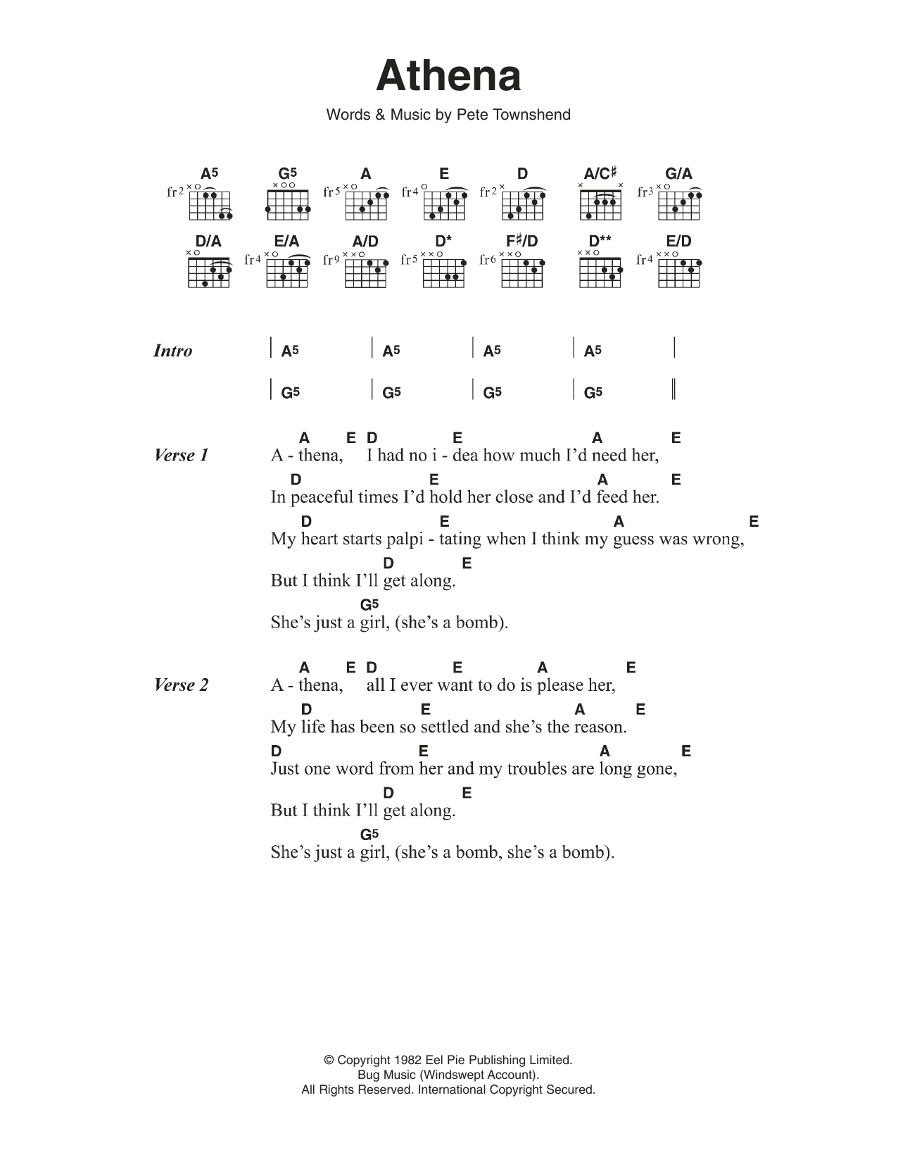 Download or print The Who Athena sheet music, chords and digital score arranged for Guitar Tab. This Pop score includes 11 page(s).