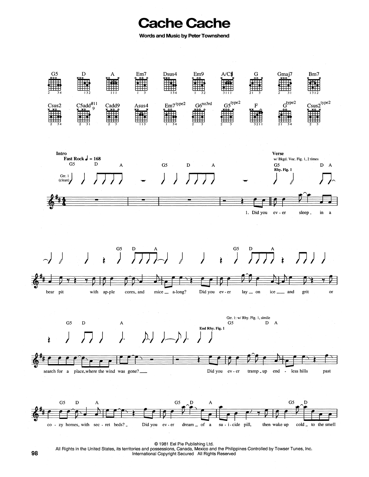 Download or print The Who Cache Cache sheet music, chords and digital score arranged for Guitar Tab. This Rock score includes 6 page(s).