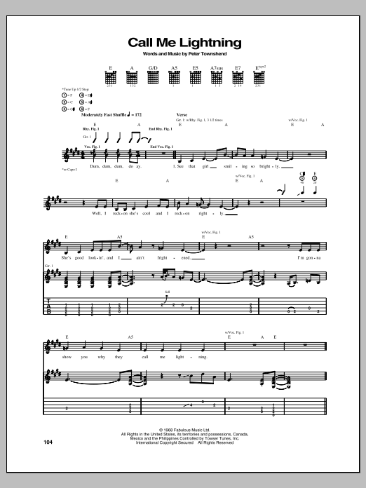 Download or print The Who Call Me Lightning sheet music, chords and digital score arranged for Guitar Tab. This Pop score includes 4 page(s).