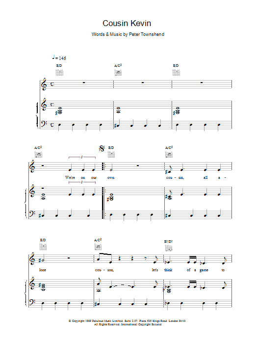 Download or print The Who Cousin Kevin sheet music, chords and digital score arranged for Piano, Vocal & Guitar Chords. This Rock score includes 6 page(s).