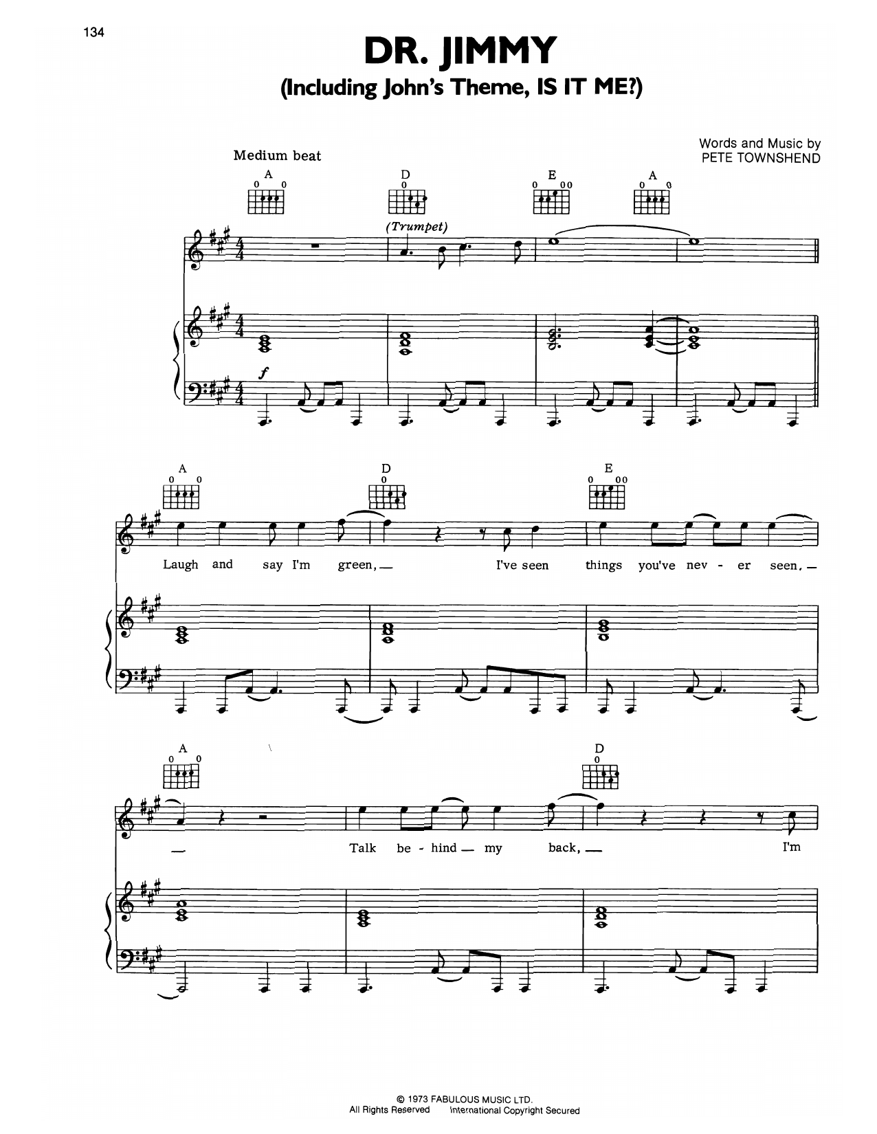 Download or print The Who Doctor Jimmy sheet music, chords and digital score arranged for Piano, Vocal & Guitar Chords (Right-Hand Melody). This Rock score includes 13 page(s).