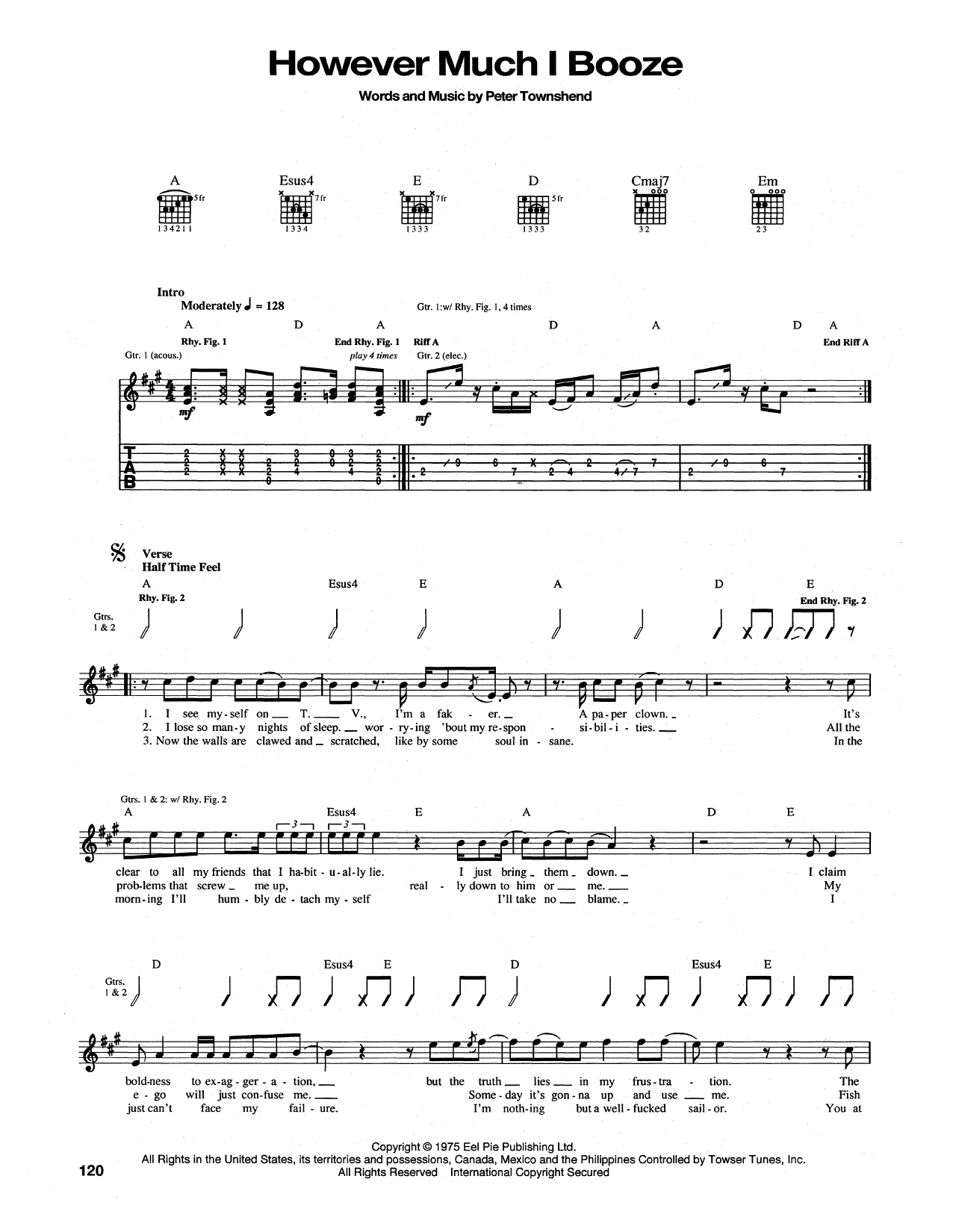 Download or print The Who However Much I Booze sheet music, chords and digital score arranged for Guitar Tab. This Pop score includes 3 page(s).