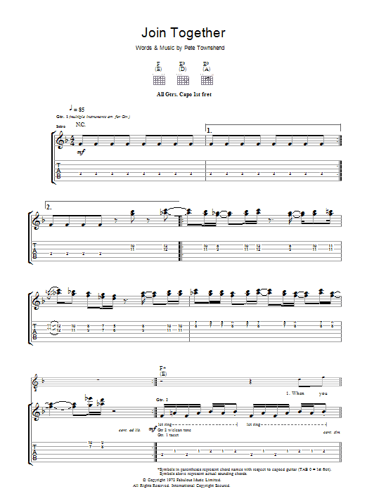 Download or print The Who Join Together sheet music, chords and digital score arranged for Guitar Tab. This Rock score includes 7 page(s).