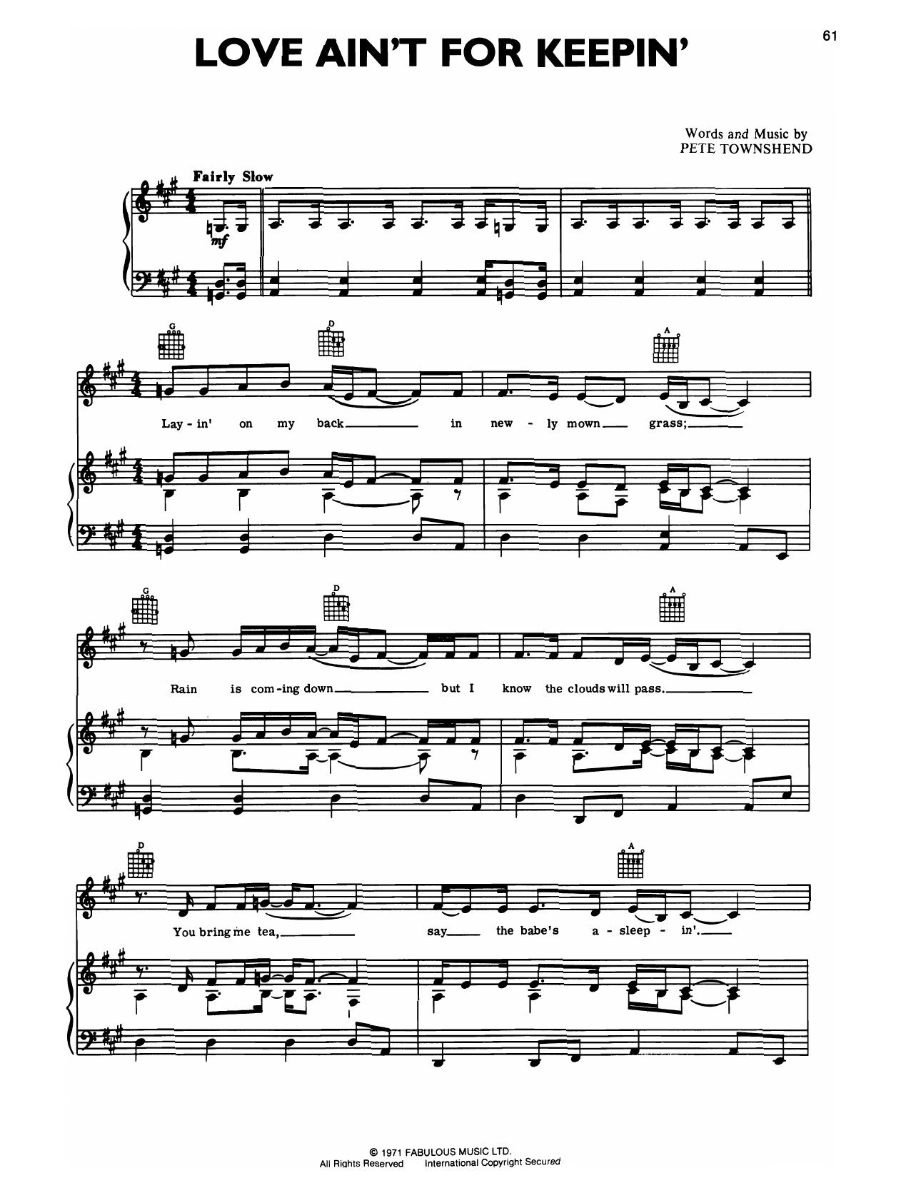 Download or print The Who Love Ain't For Keeping sheet music, chords and digital score arranged for Piano, Vocal & Guitar Chords (Right-Hand Melody). This Rock score includes 3 page(s).