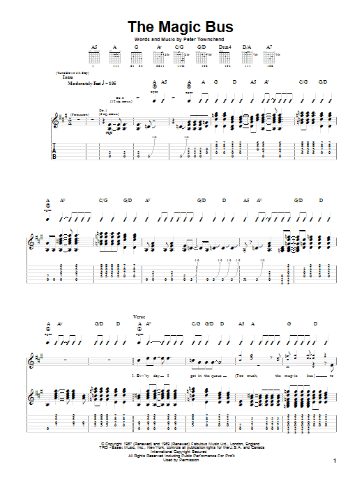 Download or print The Who Magic Bus sheet music, chords and digital score arranged for Guitar Tab (Single Guitar). This Pop score includes 7 page(s).
