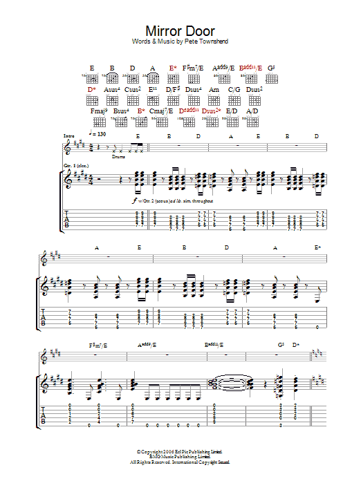 Download or print The Who Mirror Door sheet music, chords and digital score arranged for Guitar Tab. This Rock score includes 6 page(s).