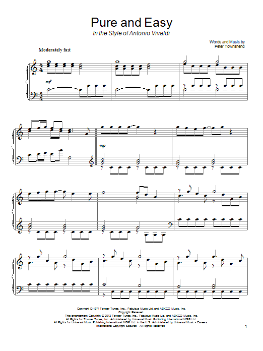 Download or print The Who Pure And Easy (in the style of Antonio Vivaldi) sheet music, chords and digital score arranged for Piano Solo. This Pop score includes 7 page(s).
