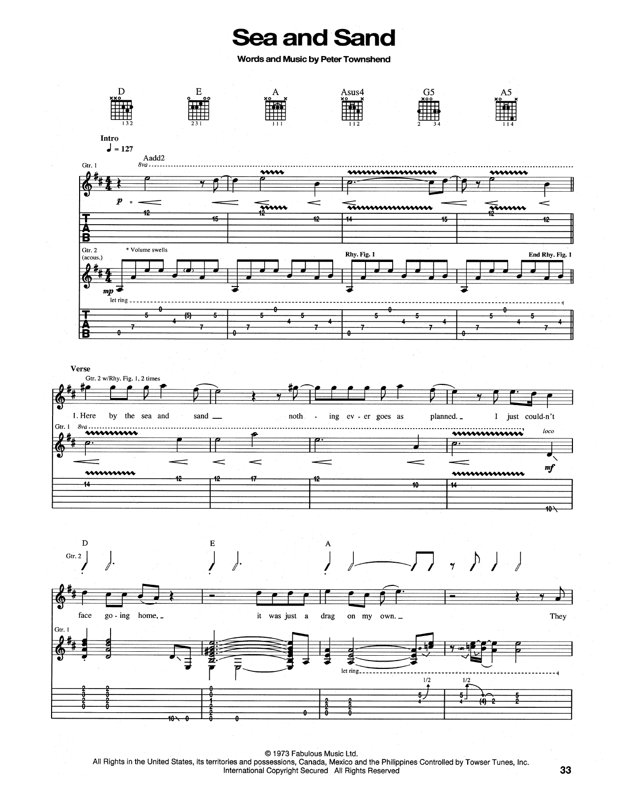Download or print The Who Sea And Sand sheet music, chords and digital score arranged for Guitar Tab. This Pop score includes 11 page(s).