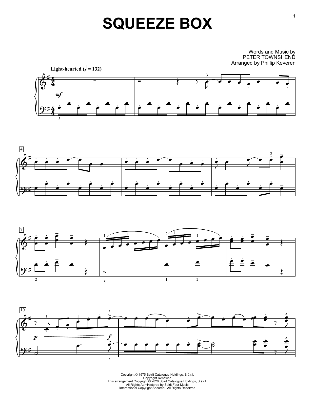 Download or print The Who Squeeze Box [Classical version] (arr. Phillip Keveren) sheet music, chords and digital score arranged for Piano Solo. This Rock score includes 3 page(s).